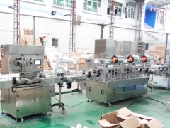 人工上瓶---检测自动拦瓶---自动灌装—拦瓶自动打开---防滴漏漏打开---分瓶机构自动分瓶---自动拦瓶---铝箔封口—拦瓶自动打开---分瓶机构自动分瓶---定位贴标---人工收瓶。