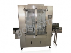 设备底部传输定位装置根据灌装头的数量提前设定定位位置,灌装瓶经过传输线传送到设备底部灌装位置,灌装头向下深入灌装瓶内,根据提前设定好的灌装计量进行灌装。