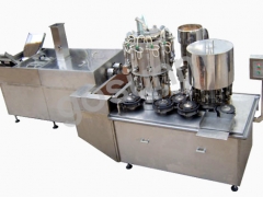 本机是灌装,轧盖二合一的高速灌封机,属于专用灌装设备系列,适用于各种10ml-30ml 玻璃瓶的液体灌装和轧盖。机器采用潜入式灌装机构,灌装时,灌装头自动伸入瓶内,液体无溢出,可连接到配套设备系列下的板链输送机。机器在采用高精度计量机构,不锈钢单阀门,灌装计量调整方便;给合式灌装管路及灌装部件,拆卸,消毒十分方便,根据不同的盖子,轧盖力大小可调速,保证瓶盖外观封口美观;采用变频调整系统,能方便地适应各种不同规格的瓶子及不同粘度液体灌装的不同需求。