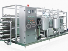 管式超高温灭菌机广泛用于液态食品“无菌”和“非无菌”热处理的全自动系统,产品的粘度范围很大,并能适应纤维和颗粒。本公司的UHT灭菌机系列生产能力可以从1~30t/h,典型的灭菌温度为90~140℃,能连接任何灌装生产线(无菌的或其他类型的,如红酒灌装线),灭菌机和控制系统安装在底架上,控制元件均采用国际名牌产品,包括PLC程控器及工控屏、蒸汽减压及调节阀、分流阀、稳压阀、物料泵、热水泵。其他阀及管接件等所有液体配件都选用高质量和高可靠的。本灭菌机设计为高精度的产品/水的温差控制。产品从平衡罐泵人,预热到均质温度,再预热到90~95℃,进行乳蛋白质的稳定,然后超高温灭菌,最后冷却到灌装温度。系统用热水预杀菌是在循环回路中,节省能源。管子的的直径、形状(平直或波纹的)和管束的选择由产品的需要决定。每组换热器只需4个O形垫圈(仅在介质端),每年只需检查一次。可以选择热灌装,如90℃。经济的加工手段,可采用半自动机组,同样也获得相同的效果。另一种板式的杀菌设备,板式超高温杀菌机,主要用于牛奶饮料的杀菌。